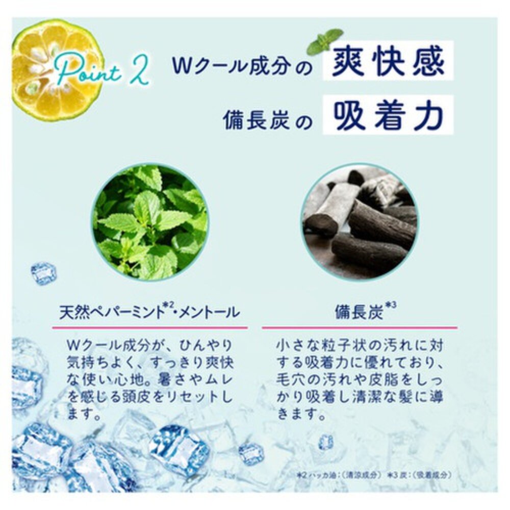 薄荷醇與天然薄荷精油帶來冰涼舒暢的洗感;備長炭成分深入毛孔,吸附油脂與污垢,洗後輕盈清新不黏膩。