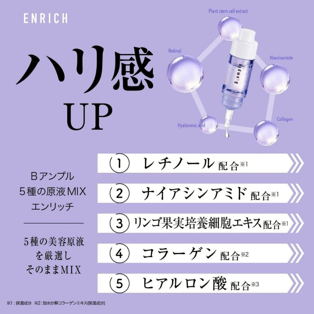 💜內含A醇、菸鹼醯胺、膠原蛋白、玻尿酸、蘋果酵素等五大美容成分!一樣都是由濃縮原液打造而成!對於回復彈力豐潤、撫平皺紋、緊緻肌膚,具有顯著效果!讓肌膚搭上時光機找回年輕的豐彈美肌
