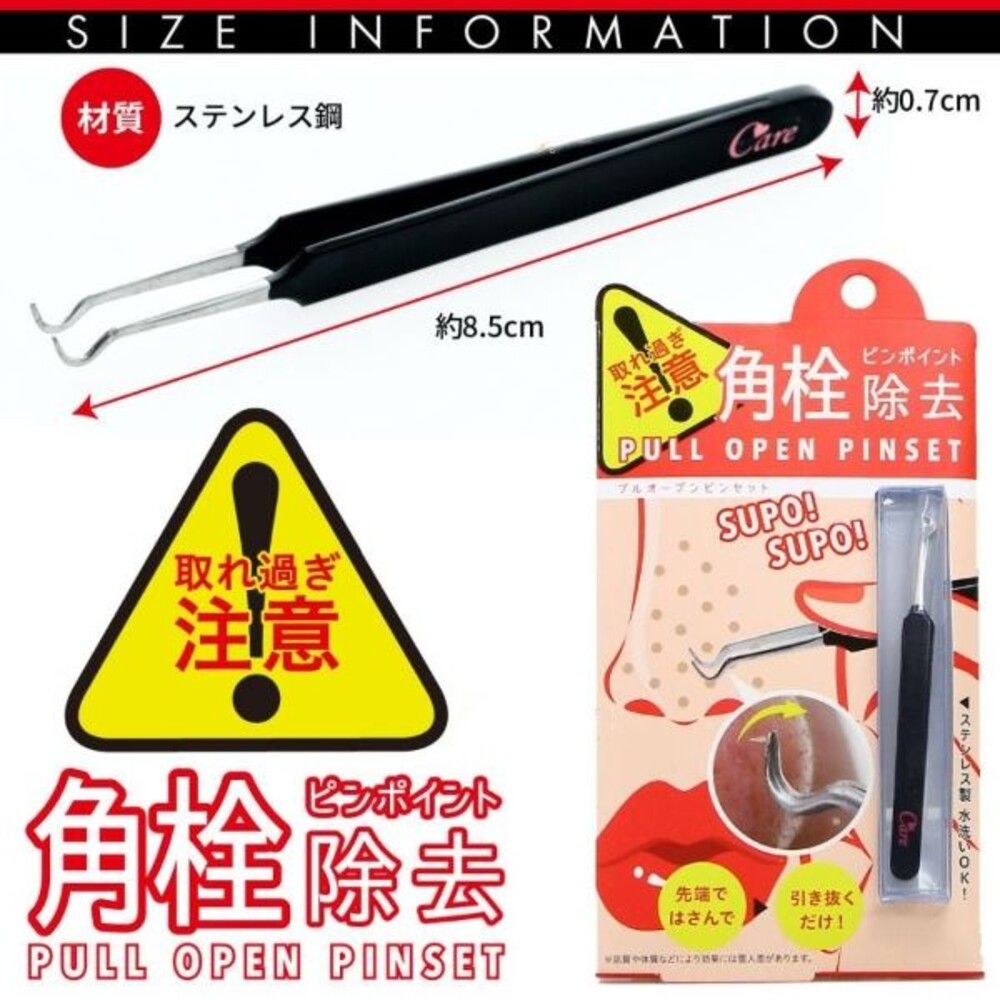 #預購商品要2-3周左右才到貨,急單勿下,謝謝 只需將令人在意的黑粉刺用夾子的前端輕輕夾住, 然後拔出即可。可以集中而快速地將黑頭粉刺拔出, 對皮膚的傷害小,因此也能有效保護毛孔。 結構設計便於抓握,與手型十分匹配。不鏽鋼質地,可水洗。 材料:不鏽鋼 顏色:黑色 尺寸:全長約8.7cm 材質 : 不銹鋼 產地 : 日本 製造 : 中國